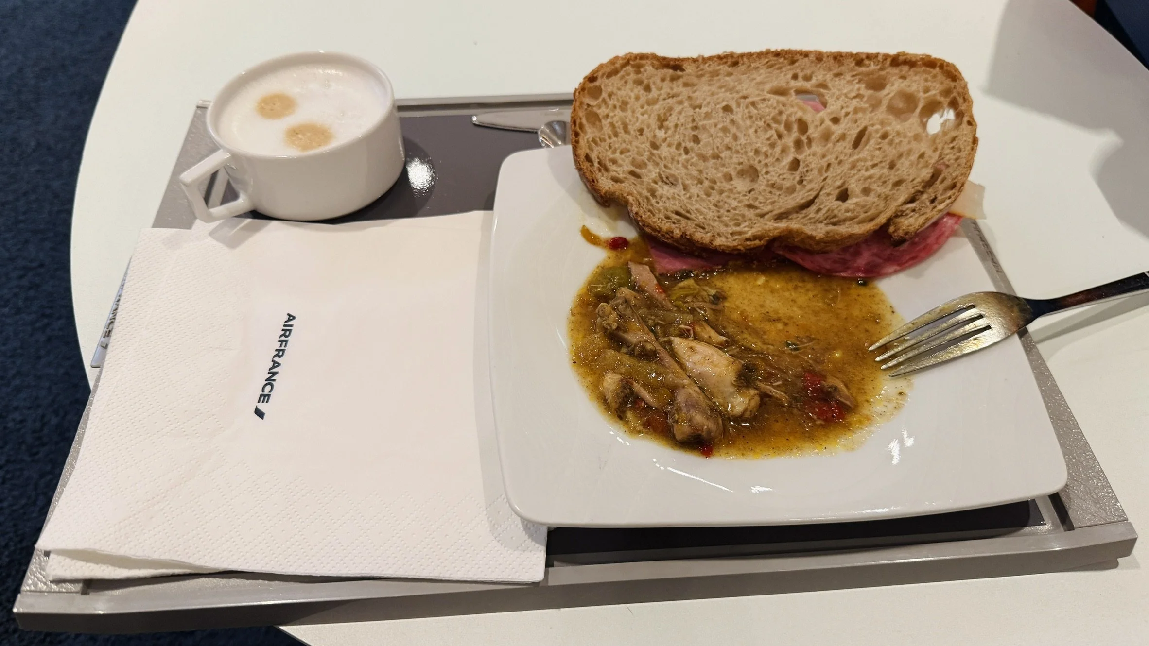 It was difficult to find a high protein option. I ended up trying a lemon chicken dish which had a lot of bones and skin. It tasted all right. I tried a pastrami sandwich after and I found the food a bit disappointing overall considering this is Air France’s hub and this is a lounge for business class passengers. The food on the plane (read more about the flight) tasted far better and felt more fresh than what I experienced at the lounge.