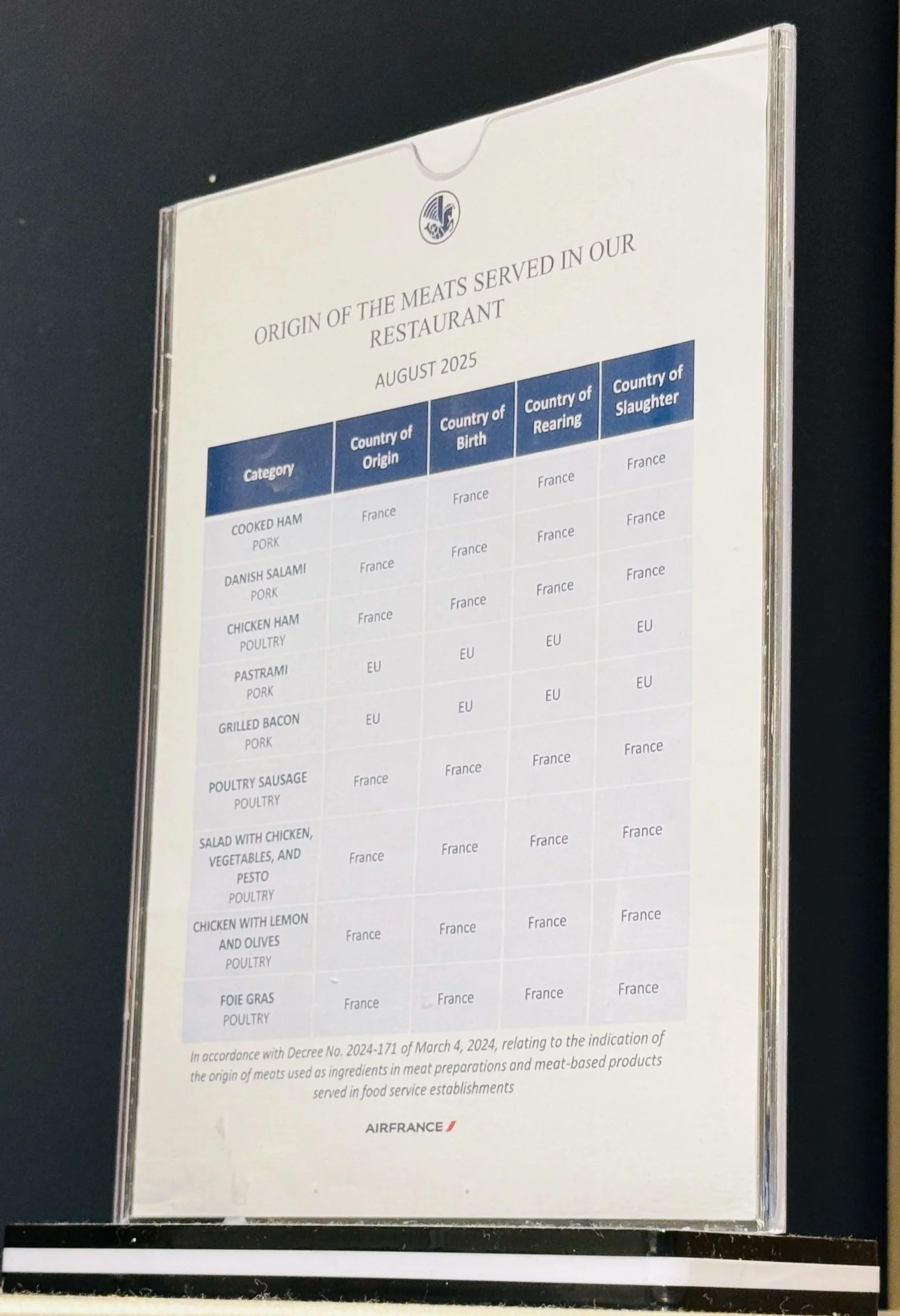 One noteworthy detail was this chart below that listed the country of origin for every meat product they served! Whether that’s to support local French agriculture or EU agriculture, it was nonetheless a great initiative to inform consumers (based on the disclaimer, it looks like this is due to a law). I really wish this was a law in Canada too!